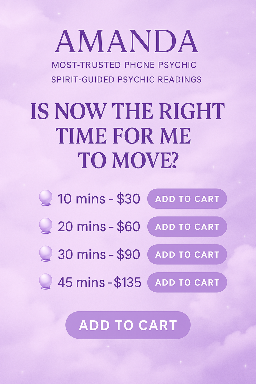 Speak directly with Amanda from anywhere in the country. A live session with a phone psychic in Australia gives you real-time, one-on-one guidance that’s clear, direct, and highly personal. Ask about love, work, family, or spiritual blocks — and receive immediate answers.