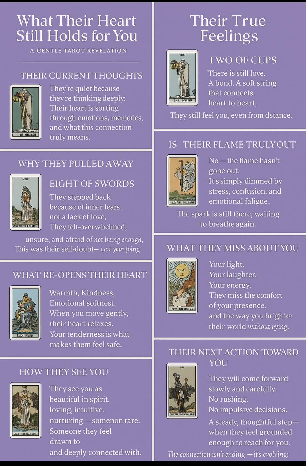 This deep, intuitive tarot insight is designed to help you understand their true emotions, fears, intentions, and the future potential between you—even if you’re currently in no contact.