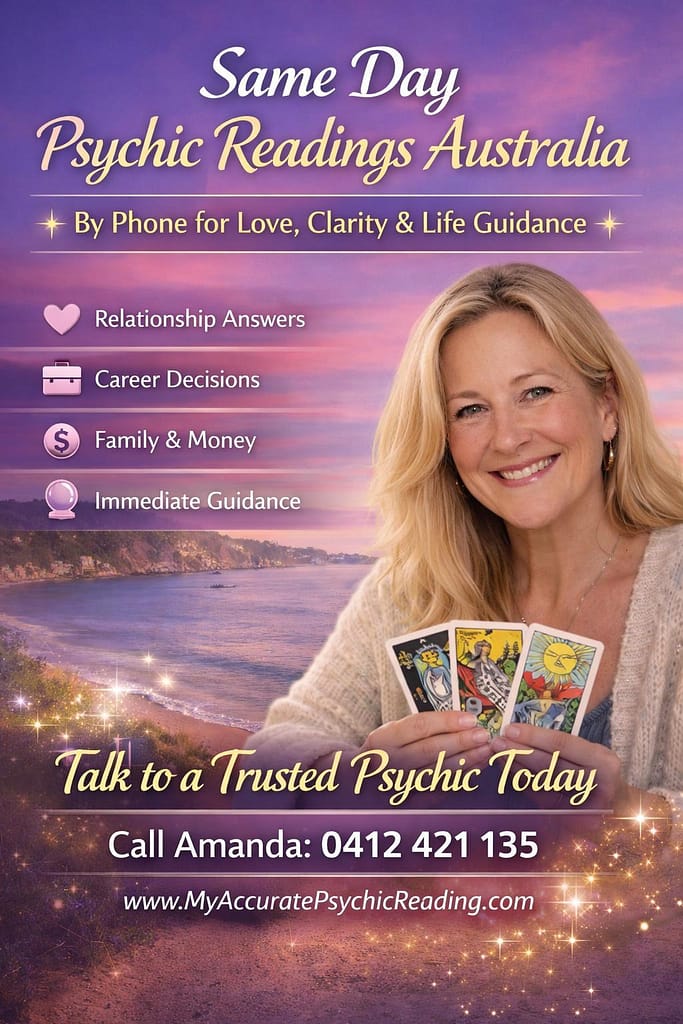 Same Day Psychic Readings Australia by Phone | Love, Clarity and Life Guidance ✨ If you need clarity today, I offer same day psychic readings Australia wide by phone for people who want honest answers about love, relationships, career, family, timing, and life direction. Many people come to me when they feel emotionally overwhelmed, confused about someone’s feelings, uncertain about the future, or stuck at a major crossroads. A phone psychic reading can help bring immediate insight when you need guidance most. My readings are private, focused, and designed for people who want a real connection and a direct answer. If you have been searching for a psychic reading today, an immediate psychic reading, a phone psychic reading now, or want to talk to a psychic now, this service is for you. I work with people across the country who are looking for trusted psychic readings, accurate psychic reading sessions, trusted psychic readings Australia, and genuine spiritual guidance without having to leave home. A lot of people contact me for a love psychic reading phone session because they want to know what someone is truly feeling, whether a relationship still has a future, or if it is finally time to move on. Others book a relationship psychic reading to understand mixed signals, silence, emotional distance, or whether reconciliation is possible. Some want a psychic reading about ex partners, some are looking for a break up psychic reading, and others ask for a does he love me psychic reading or what is he thinking psychic reading because they need clear emotional truth. I also help clients with work, money, and personal decisions. A same day psychic reading can be very helpful when you are dealing with career stress, uncertainty around a job, family issues, or major changes in your life. Sometimes you already know deep down that something is shifting, but you need confirmation, direction, and timing. That is where a clear and grounded phone psychic reading Australia wide can make all the difference. Because I offer psychic readings Australia wide by phone, you do not need to travel or wait for an in-person appointment. Many people find a private phone psychic reading more comfortable because they can relax in their own space and ask the questions that really matter. The reading is about getting to the heart of the situation quickly, without distraction. This is especially important when you need a same day psychic reading Australia service you can trust, or when you feel ready to call a psychic now for fast clarity. If you have searched for services like Kasamba, Absolute Soul Secrets, or a life reader, you may now be looking for something more personal, private, and direct. I offer same day psychic readings Australia wide by phone for people who want honest guidance, trusted psychic readings, and real clarity around love, relationships, timing, and life direction. People often ask me questions like: What are they really thinking? Is this relationship moving forward? Should I stay or go? Will my ex contact me again? Am I making the right decision? What is coming next for me? These are exactly the kinds of questions a psychic reading call, love psychic reading phone, or relationship psychic reading can help explore. Whether you want guidance around love, timing, family, money, or life direction, the aim is always to give you clarity you can actually use. If you have been searching for trusted psychic readings Australia, accurate psychic reading services, an immediate psychic reading, real phone psychic guidance, supportive phone readings, a trusted phone psychic, or even a more personal alternative to Kasamba, Absolute Soul Secrets, or a generic life reader, I would be honoured to read for you. My work is for people who want truth, not fluff — and who are ready to understand what is unfolding in their life right now. If you are ready for a same day psychic reading, a love psychic reading phone session, a relationship psychic reading, a psychic reading about ex, or a break up psychic reading anywhere in Australia, you can contact me today. I offer same day psychic readings Australia wide by phone for people who need answers, clarity, and direction now. 📞 Call Amanda – 0412 421 135🌐 www.myaccuratepsychicreading.com