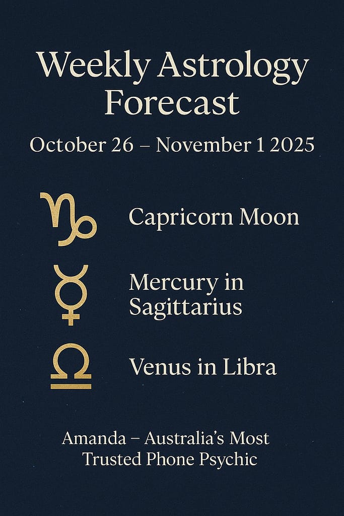 🌟 Weekly Astrology Forecast: October 26 – November 1, 2025 By Amanda – Australia’s Most Trusted Phone Psychic If life has felt messy lately, you’re not imagining it. The stars have been stirring up change, asking us to face what we’ve outgrown. But this week brings a breath of fresh air — a chance to organise, reconnect, and find peace again. Here’s your weekly astrology forecast to help you align your energy and make the most of what’s unfolding. ⸻ 🔮 Sunday to Tuesday: Get Grounded and Focused The Capricorn Moon moves in Sunday night, helping us get serious about routines, money, and responsibilities.This isn’t punishment — it’s a cosmic reset button. Clear clutter, plan meals, sort paperwork, or balance your budget.Even one small, practical step will feel like you’ve got control back. ✨ Psychic insight: When you bring order to your outer world, the Universe matches that energy.You’ll feel calmer, stronger, and ready for what’s next. Keywords: Capricorn Moon meaning, weekly horoscope 2025, psychic reading Australia ⸻ 💬 Wednesday: Say What You Mean On October 29, Mercury enters Sagittarius, and suddenly people are talking again.Expect honesty, ideas, and maybe a few unfiltered truths. If you’ve been holding something in — especially with a friend, partner, or coworker — this is your window to clear the air. ✨ Psychic tip: Speak from your heart, not frustration. Mercury in Sagittarius rewards courage and truth spoken with kindness. Keywords: Mercury in Sagittarius 2025, intuitive communication, accurate psychic insights ⸻ 🤝 Thursday: Strength in Numbers The Aquarius Moon inspires teamwork, community, and problem-solving.Reach out to people who share your goals or values. Whether it’s work, family, or creative projects, collaboration now brings fresh results. ✨ Psychic insight: The right allies appear when you stop trying to do it all alone. Keywords: Aquarius Moon forecast, teamwork astrology, psychic guidance Australia ⸻ 💫 Friday & Saturday: Let Your Heart Lead From Friday afternoon, the Moon moves into Pisces and aligns beautifully with Venus in Libra.It’s a soft, emotional, heart-opening energy — perfect for rest, self-care, romance, art, and reflection.You might dream vividly or feel drawn to music, spirituality, or compassion work. ✨ Psychic insight: When you slow down, the signs appear. Spirit speaks through stillness, not noise. Keywords: Pisces Moon meaning, Venus in Libra love forecast, intuitive psychic readings ⸻ 🌕 Amanda’s Message for the Week This week’s astrology reminds us that life works best in rhythm:Organise → Express → Connect → Rest. There’s no need to rush the process.Everything you rebuild now — from finances to friendships — becomes the foundation for a calmer, more abundant chapter in 2026. Trust that your higher self is leading you exactly where you need to be. 💜 ⸻ 🔮 Book a Psychic Reading with Amanda If you’d like deeper insight into your career, love life, or spiritual path, Amanda’s readings combine intuitive guidance with astrology and tarot to bring clarity and peace. 📞 Call Amanda: 0412 421 135🌐 Visit: www.myaccuratepsychicreading.com