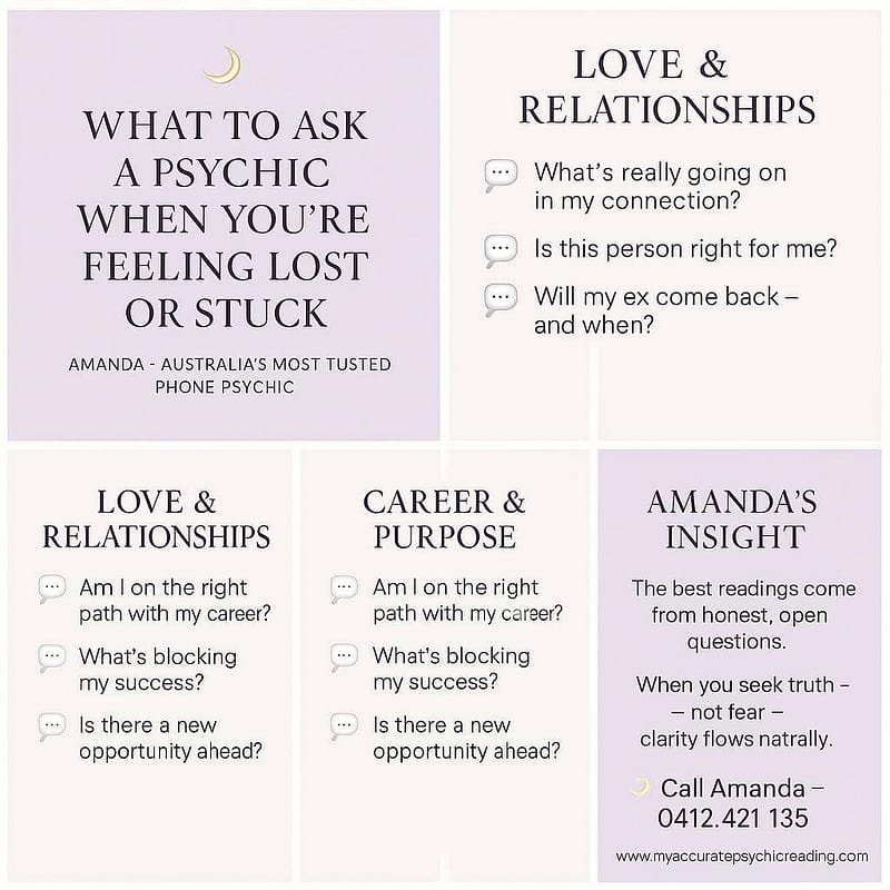 By Amanda – Australia’s Most Trusted Phone Psychic We all reach moments when life feels uncertain — when you’re standing at a crossroads, your heart is heavy, and you’re unsure which path to take. Maybe it’s a relationship that’s breaking your heart, a job that no longer feels right, or a deep sense that something is about to change. That’s often the moment Spirit nudges you to reach out for guidance. A psychic reading isn’t just about predicting the future — it’s about finding clarity, calm, and the confidence to move forward with purpose. ⸻ 💫 What You Can Ask During a Psychic Reading If you’re booking a psychic reading for the first time (or after a while), you might wonder what to ask. The truth is — there are no wrong questions. Spirit meets you exactly where you are. Here are a few questions that open the door to deeper insight: ❤ Love & Relationships• “What’s really going on in my connection right now?”• “Is this person right for me — or is it time to let go?”• “Will my ex come back, and if so, when?” 💼 Career & Purpose• “Am I on the right path with my career?”• “What’s blocking my success or motivation?”• “Is there a new opportunity or direction I should explore?” 🌿 Life Direction & Clarity• “What do I need to understand about this cycle I’m in?”• “What’s the universe trying to teach me right now?”• “What should I focus on to move forward with peace?” ⸻ 🔮 Why the Right Questions Matter The energy behind your question shapes the reading itself. When you ask from a place of honesty — not fear — the answers that come through are clearer, deeper, and often life-changing. Instead of asking, “Will I ever be happy?” try, “What can I do to invite more happiness into my life?”Spirit always meets action — and the right question helps reveal the next step. ⸻ 🌕 Amanda’s Insight The most powerful readings happen when you come with an open heart and a real desire for truth. I don’t tell people what they want to hear — I share what Spirit shows for their highest good. Whether it’s love, career, or personal healing, clarity comes the moment you’re ready to hear it. ⸻ 📞 Book a Psychic Reading with Amanda When life feels uncertain, don’t sit in confusion. A compassionate and accurate phone reading can help you see what’s really happening — and what’s next. ✨ Private | Accurate | Uplifting📞 Call Amanda – 0412 421 135🌐 www.myaccuratepsychicreading